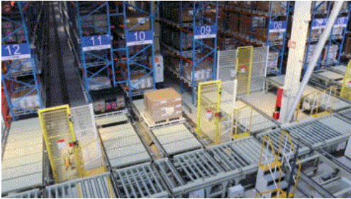 The whole pallet of material is moved to warehousing transport line to flow to the altitude storage rack when material needs warehousing.